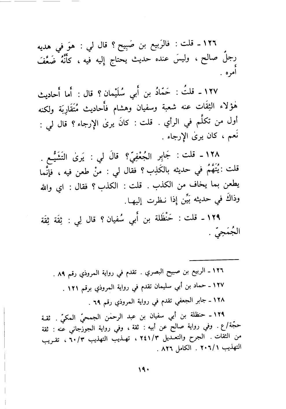 127 - قلت حَمَّاد بن أبي سُلَيْمَان قَالَ أما أَحَادِيث هَؤُلَاءِ الثِّقَات عَنهُ شُعْبَة وسُفْيَان وَهِشَام فأحاديث مُتَقَارِبَة وَلكنه أول من تكلم فِي الرَّأْي قلت كَانَ يرى الإرجاء قَالَ لي نعم كَانَ يرى الإرجاء