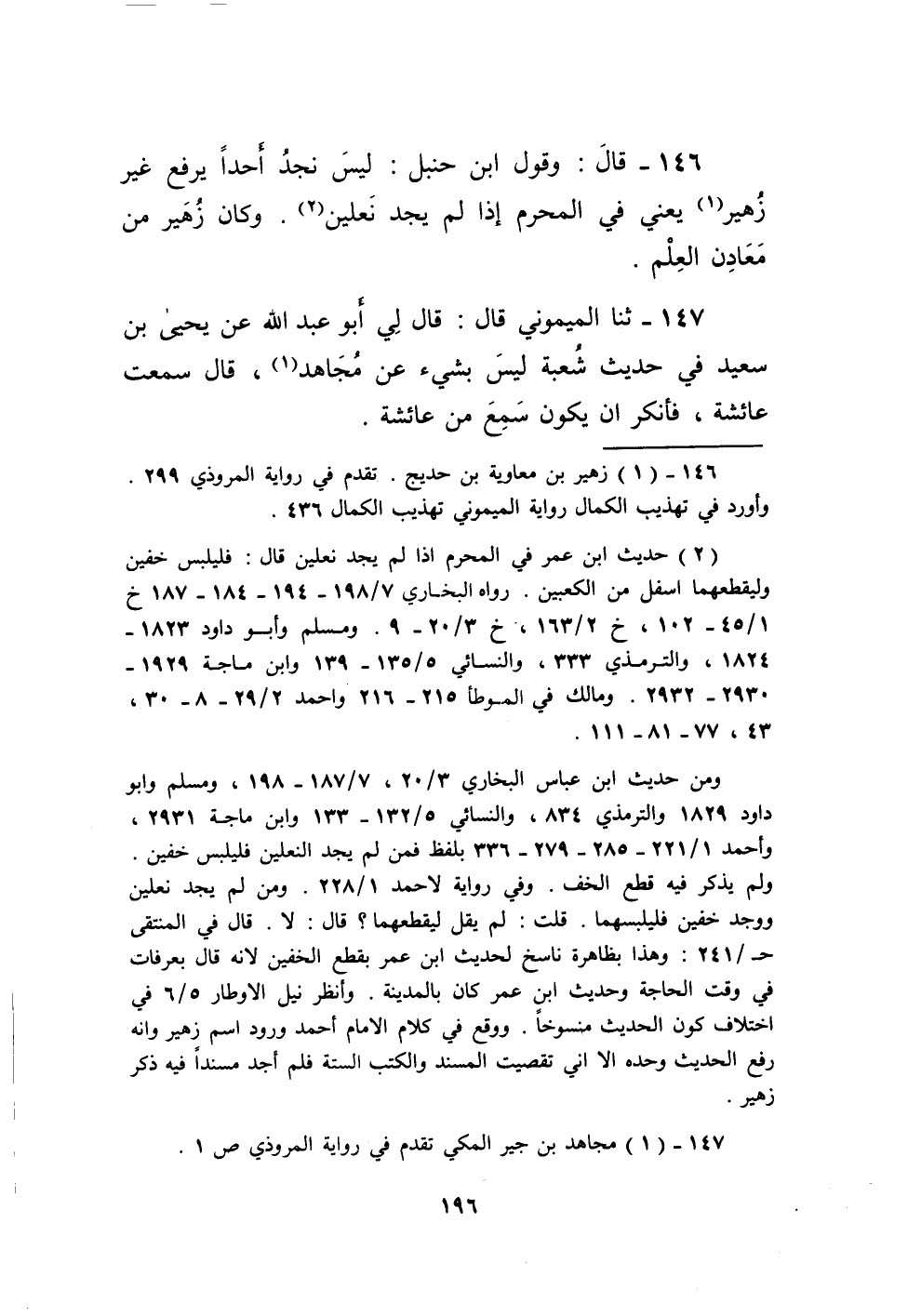 146 - قَالَ وَقَول ابْن حَنْبَل لَيْسَ نجد أحدا يرفع غير زُهَيْر يَعْنِي فِي الْمحرم إِذا لم يجد نَعْلَيْنِ وَكَانَ زُهَيْر من معادن الْعلم