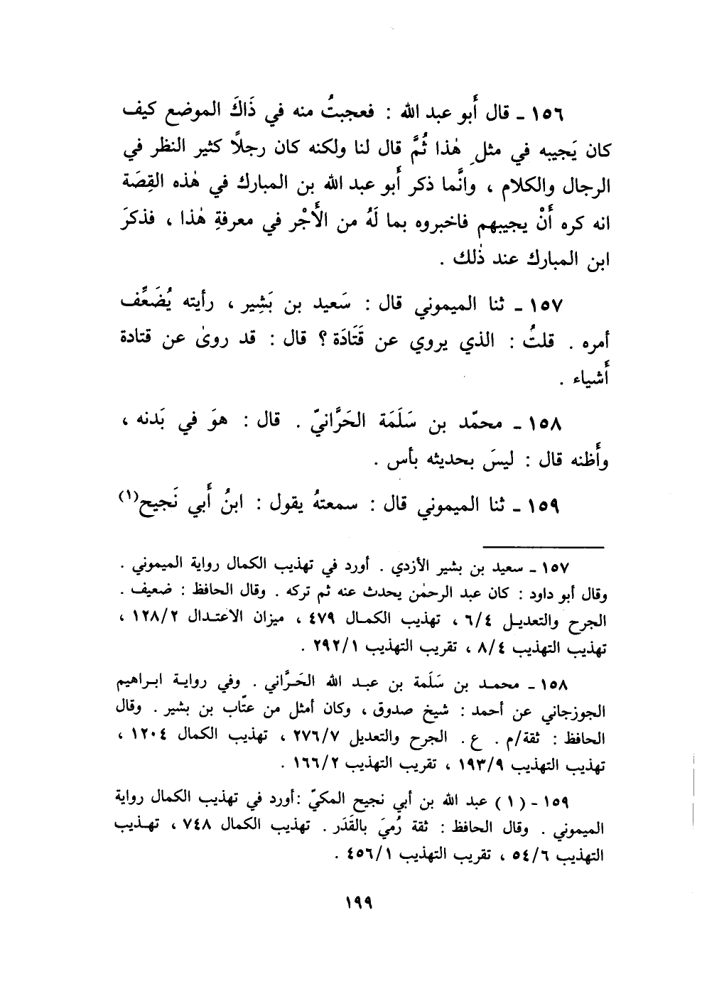156 - قَالَ أَبُو عبد الله فعجبت مِنْهُ فِي ذَاك الْموضع كَيفَ كَانَ يجِيبه فِي مثل هَذَا ثمَّ قَالَ لنا وَلكنه كَانَ رجلا كثير النّظر فِي الرِّجَال وَالْكَلَام وَإِنَّمَا ذكر أَبُو عبد الله بن الْمُبَارك فِي هَذِه الْقِصَّة أَنه كره أَن يُجِيبهُمْ فأخبروه بِمَا لَهُ من الْأجر فِي معرفَة هَذَا فَذكر ابْن الْمُبَارك عِنْد ذَلِك