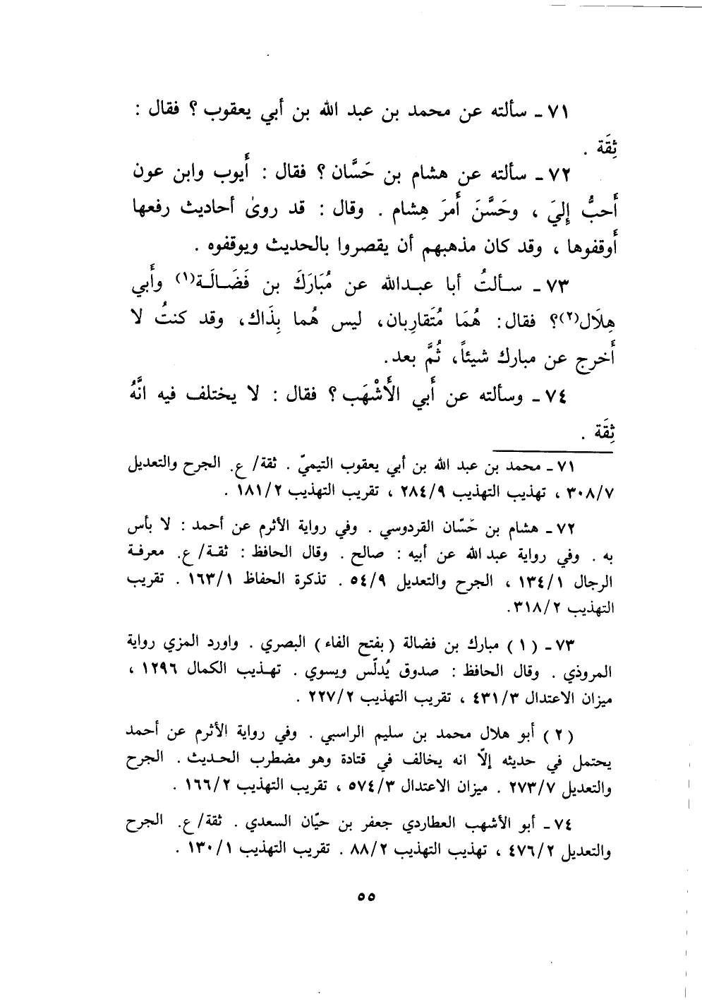 74 - وَسَأَلته عَن أَبِي الْأَشْهب فَقَالَ لَا يُخْتَلَف فِيهِ أَنه ثِقَة