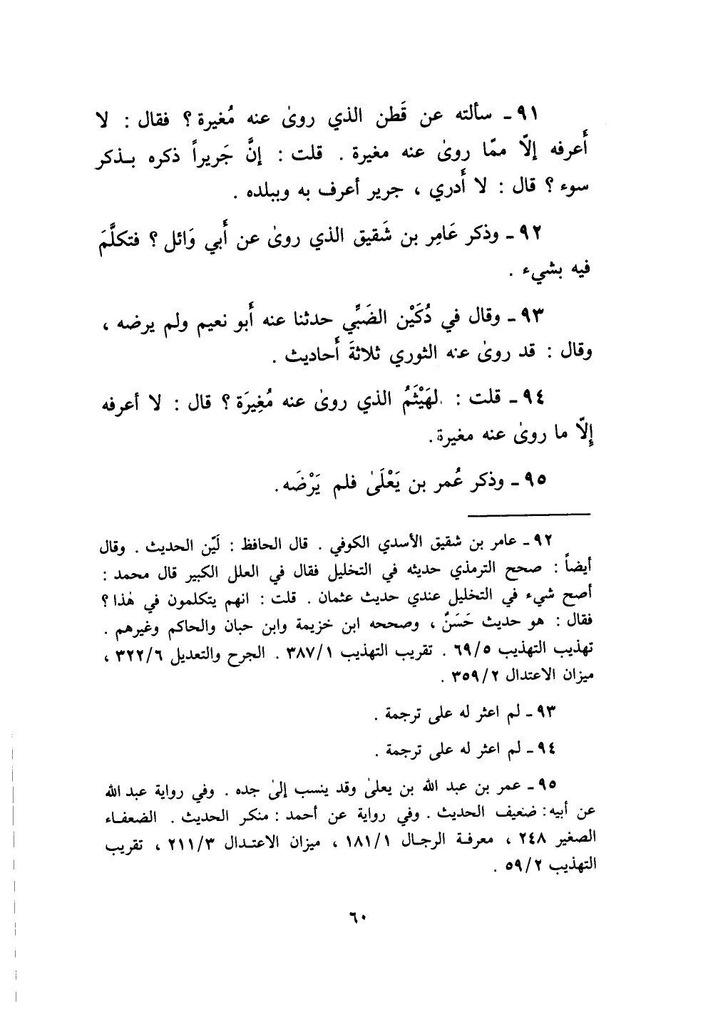 91 - سَأَلته عَن قطن الَّذِي روى عَنهُ مُغيرَة فَقَالَ لَا أعرفهُ إِلَّا مِمَّا روى عَنهُ مُغيرَة قلت إِن جَرِيرًا ذكره بِذكر سوء قَالَ لَا أَدْرِي جرير أعرف بِهِ وببلده