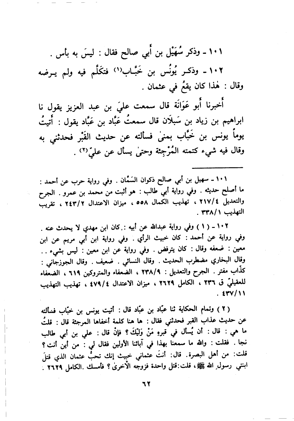 102 - وَذكر يُونُس بن خباب فَتكلم فِيهِ وَلم يرضه وَقَالَ هَذَا كَانَ يَقع فِي عُثْمَان
