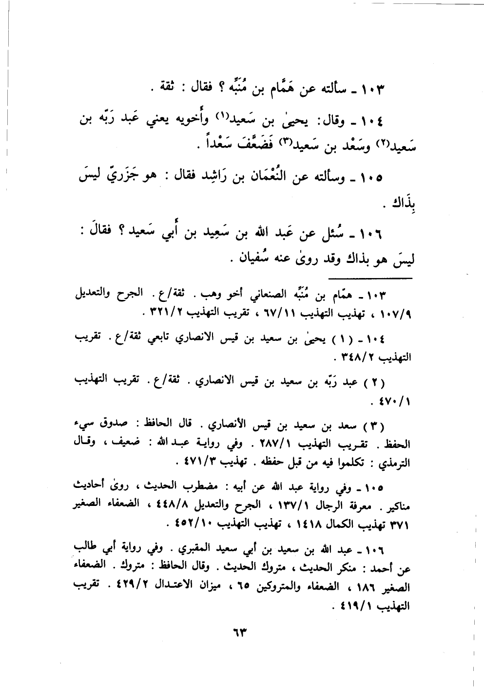 104 - وَقَالَ يحيى بن سعيد وأخويه يَعْنِي عبد ربه بن سعيد وَسعد بن سعيد فضعف سَعْدا