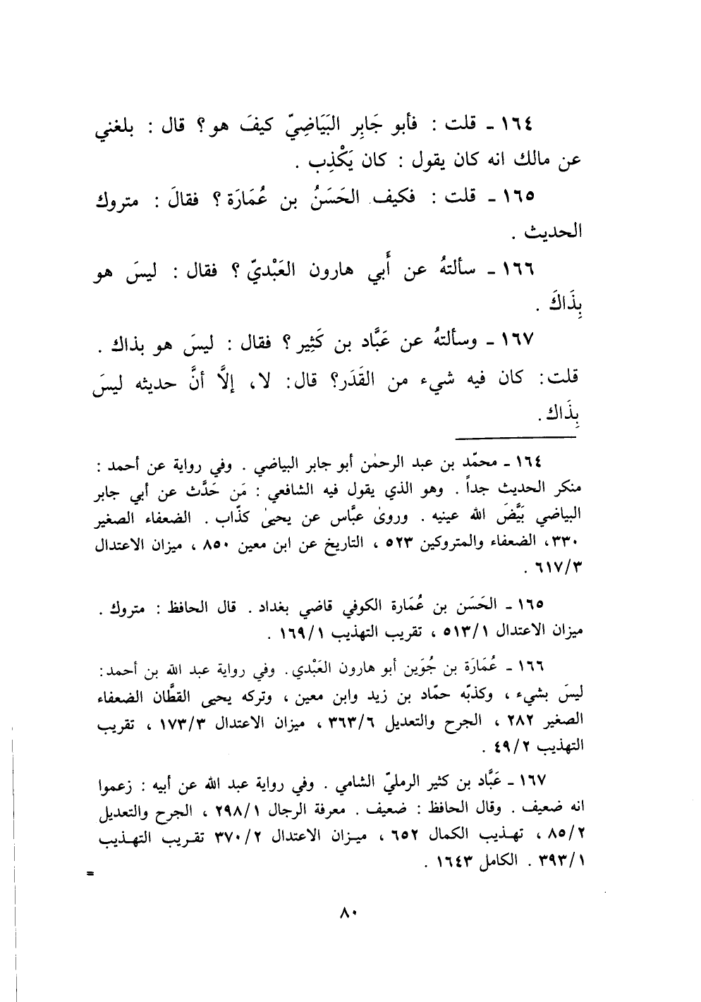 164 - قلت فَأَبُو جَابر البياضي كَيفَ هُوَ قَالَ بَلغنِي عَن مَالك أَنه كَانَ يَقُول كَانَ يكذب