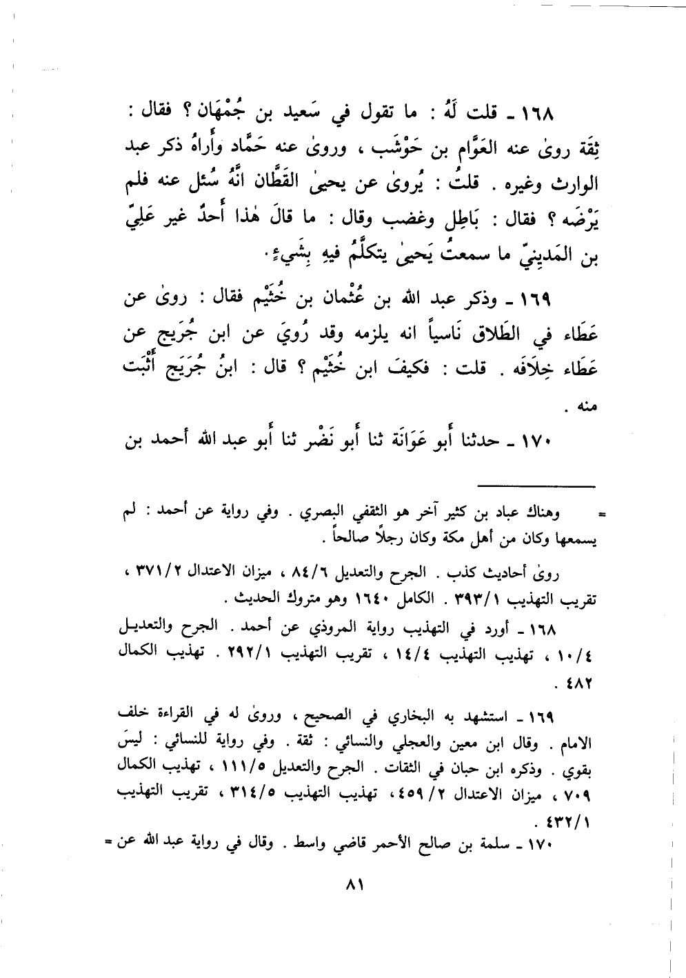 168 - قلت لَهُ مَا تَقول فِي سعيد بن جمْهَان فَقَالَ ثِقَة روى عَنهُ الْعَوام بن حَوْشَب وروى عَنهُ حَمَّاد وَأرَاهُ ذكر عبد الْوَارِث وَغَيره قلت يروي عَن يحيى الْقطَّان أَنه سُئِلَ عَنهُ فَلم يرضه فَقَالَ بَاطِل وَغَضب وَقَالَ مَا قَالَ هَذَا أحد غير عَليّ بن الْمَدِينِيّ مَا سَمِعت يحيى يتَكَلَّم فِيهِ بِشَيْء