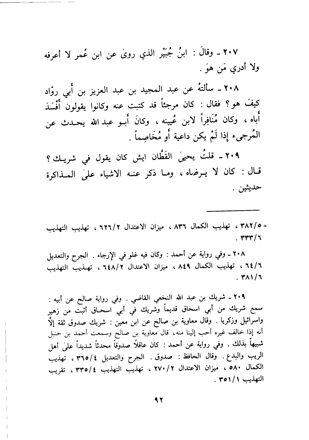 208 - سَأَلته عَن عبد الْمجِيد بن عبد الْعَزِيز بن أبي رواد كَيفَ هُوَ فَقَالَ كَانَ مرجئا قد كتبت عَنهُ وَكَانُوا يَقُولُونَ أفسد المرجىء أَبَاهُ وَكَانَ منافرا لإبن عَيْنِيَّة وَكَانَ أَبُو عبد الله يحدث عَن إِذا لم يكن دَاعِيَة أَو مخاصما