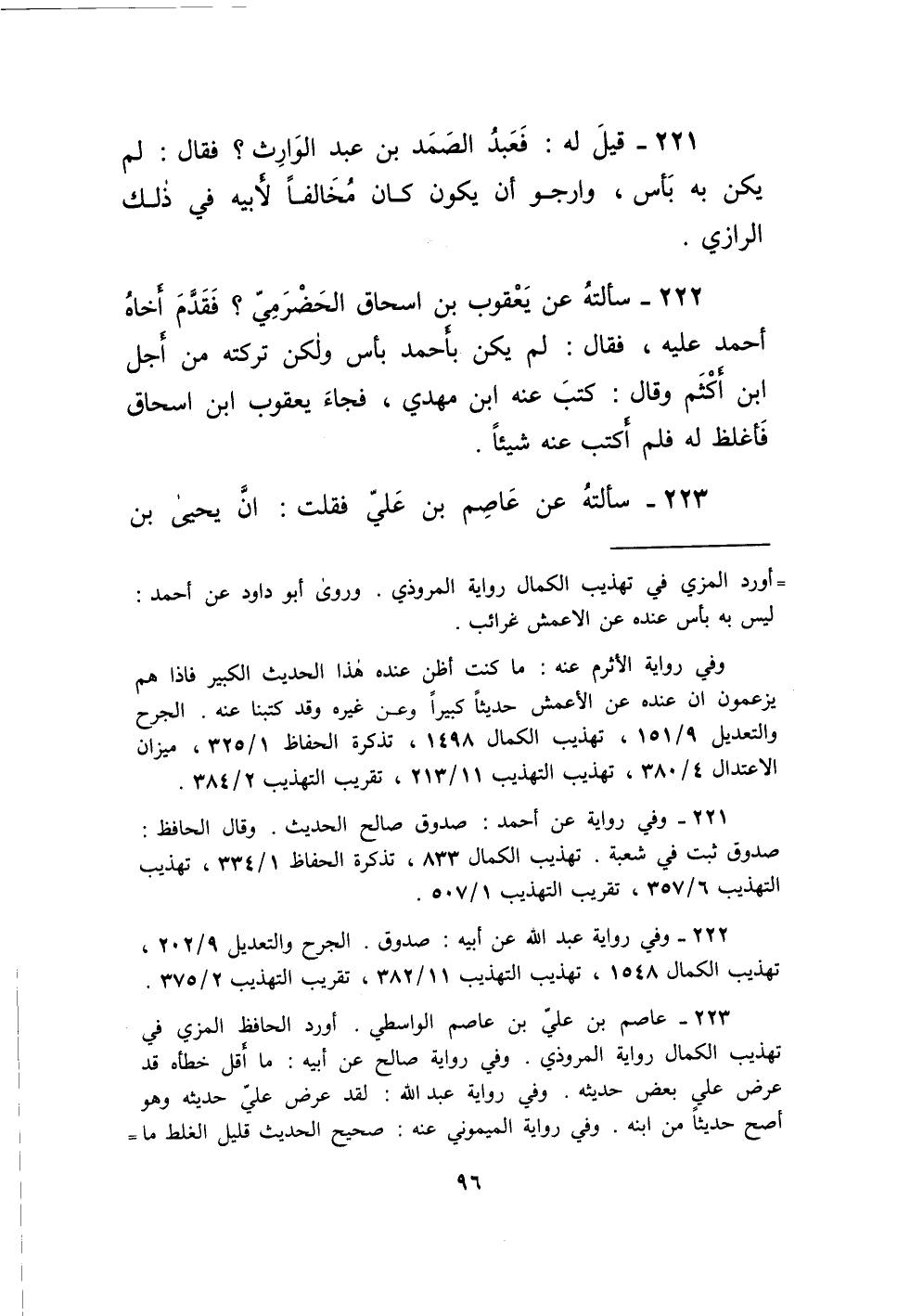 221 - قيل لَهُ فعبد الصَّمد بن عبد الْوَارِث فَقَالَ لم يكن بِهِ بَأْس وَأَرْجُو أَن يكون كَانَ مُخَالفا لِأَبِيهِ فِي ذَلِك الرَّازِيّ