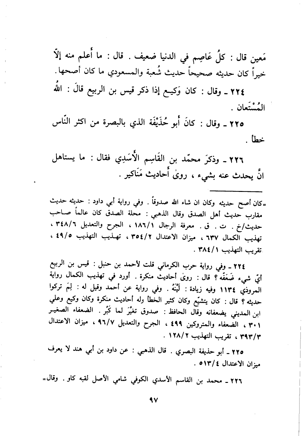 226 - وَذكر مُحَمَّد بن الْقَاسِم الْأَسدي فَقَالَ مَا يستأهل أَن يحدث عَنهُ بِشَيْء روى أَحَادِيث مَنَاكِير