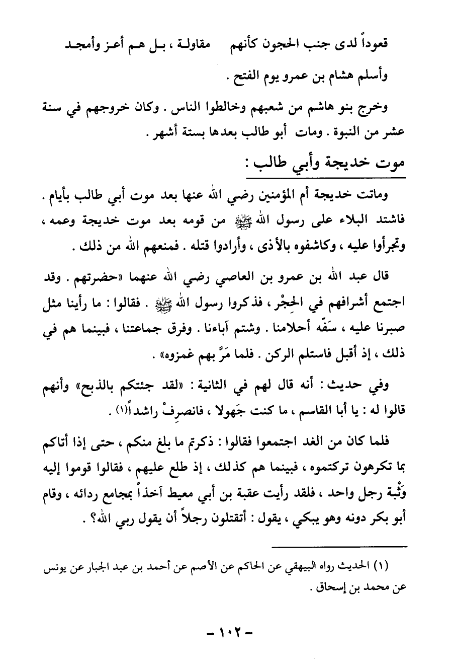 موت خديجة وأبي طالب وماتت خديجة أم المؤمنين -رضي اللَّه عنها- بعد موت أبي طالب بأيام. فاشتد البلاء على رسول اللَّه -صلى اللَّه عليه وسلم - من قومه بعد موت خديجة وعمه وتجرءوا عليه وكاشفوه بالأذى. وأرادوا قتله. فمنعهم الذي من ذلك.