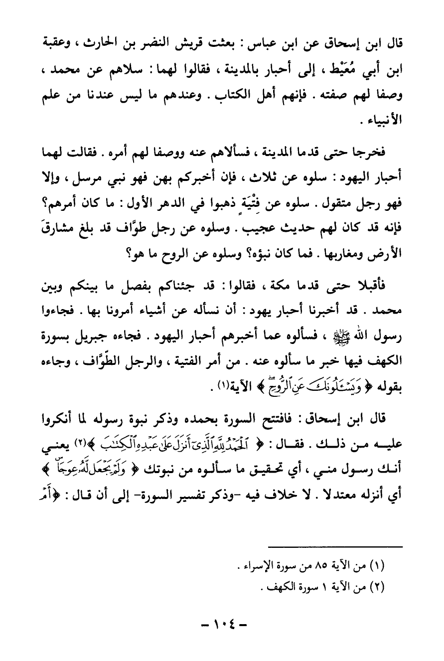 فخرجا حتى قدما المدينة، فسألاهم عنه؟ ووصفا لهم أمره. فقالت لهما أحبار اليهود: سلوه عن ثلاث. فإن أخبركم بهن فهو نبي مرسل وإلا فهو رجل منقول. سلوه عن فتية ذهبوا في الدهر الأول ما كان أمرهم؟ فإنه قد كان لهم حديث عجيب. وسلوه عن رجل طواف قد بلغ مشارق الأرض ومغاربها. فما كان نبؤه؟ وسلوه عن الروح ما هو؟ فأقبلا، حتى قدما مكة. فقالوا: قد جئناكم بفصل ما بينكم وبين محمد. قد أخبرنا أحبار يهود أن نسأله عن أشياء أمرونا بها.
