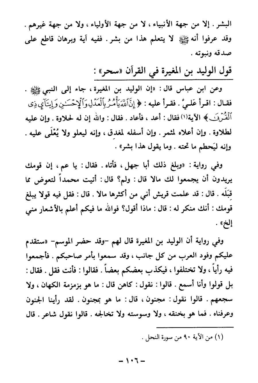 قول الوليد بن المغيرة في القرآن " سحر " وعن ابن عباس قال «إن الوليد بن المغيرة جاء إلى النبي -صلى اللَّه عليه وسلم - فقال اقرأ علي. فقرأ عليه {إِنَّ اللَّهَ يَأْمُرُ بِالْعَدْلِ وَالْإِحْسَانِ وَإِيتَاءِ ذِي الْقُرْبَى} [النحل: 90]- الآية (¬1) فقال أعد. فأعاد. فقال واللَّه إن له لحلاوة. وإن عليه لطلاوة. وإن أعلاه لمثمر. وإن أسفله لمغدق. وإنه ليعلو ولا يعلى عليه. وإنه ليحطم ما تحته. وما يقول هذا بشر» .