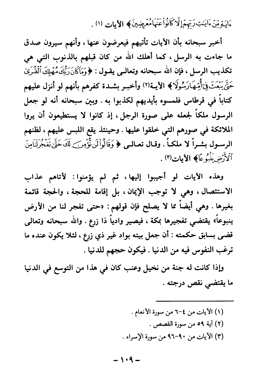 وقال تعالى {وَقَالُوا لَنْ نُؤْمِنَ لَكَ حَتَّى تَفْجُرَ لَنَا مِنَ الْأَرْضِ يَنْبُوعًا} [الإسراء: 90]- الآيات (¬2) . وهذه الآيات لو أجيبوا إليها، ثم لم يؤمنوا: لأتاهم عذاب الاستئصال وهي لا توجب الإيمان بل إقامة للحجة والحجة قائمة بغيرها. وهي أيضا مما لا يصلح فإن قولهم {حَتَّى تَفْجُرَ لَنَا مِنَ الْأَرْضِ يَنْبُوعًا} [الإسراء: 90] يقتضي تفجيرها بمكة فيصير واديا ذا زرع واللَّه سبحانه وتعالى قضى بسابق حكمته أن جعل بيته بواد غير ذي زرع لئلا يكون عنده ما ترغب النفوس فيه من الدنيا. فيكون حجهم للدنيا.