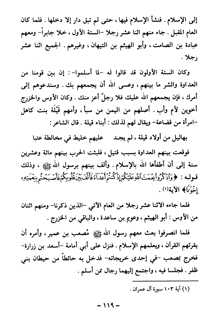 إلى الإسلام. فنشأ الإسلام فيها، حتى لم تبق دار إلا ودخلها. فلما كان العام المقبل جاء منهم اثنا عشر رجلا - الستة الأول. خلا جابرا - ومعهم عبادة بن الصامت، وأبو الهيثم بن التيهان، وغيرهم. الجميع اثنا عشر رجلا.