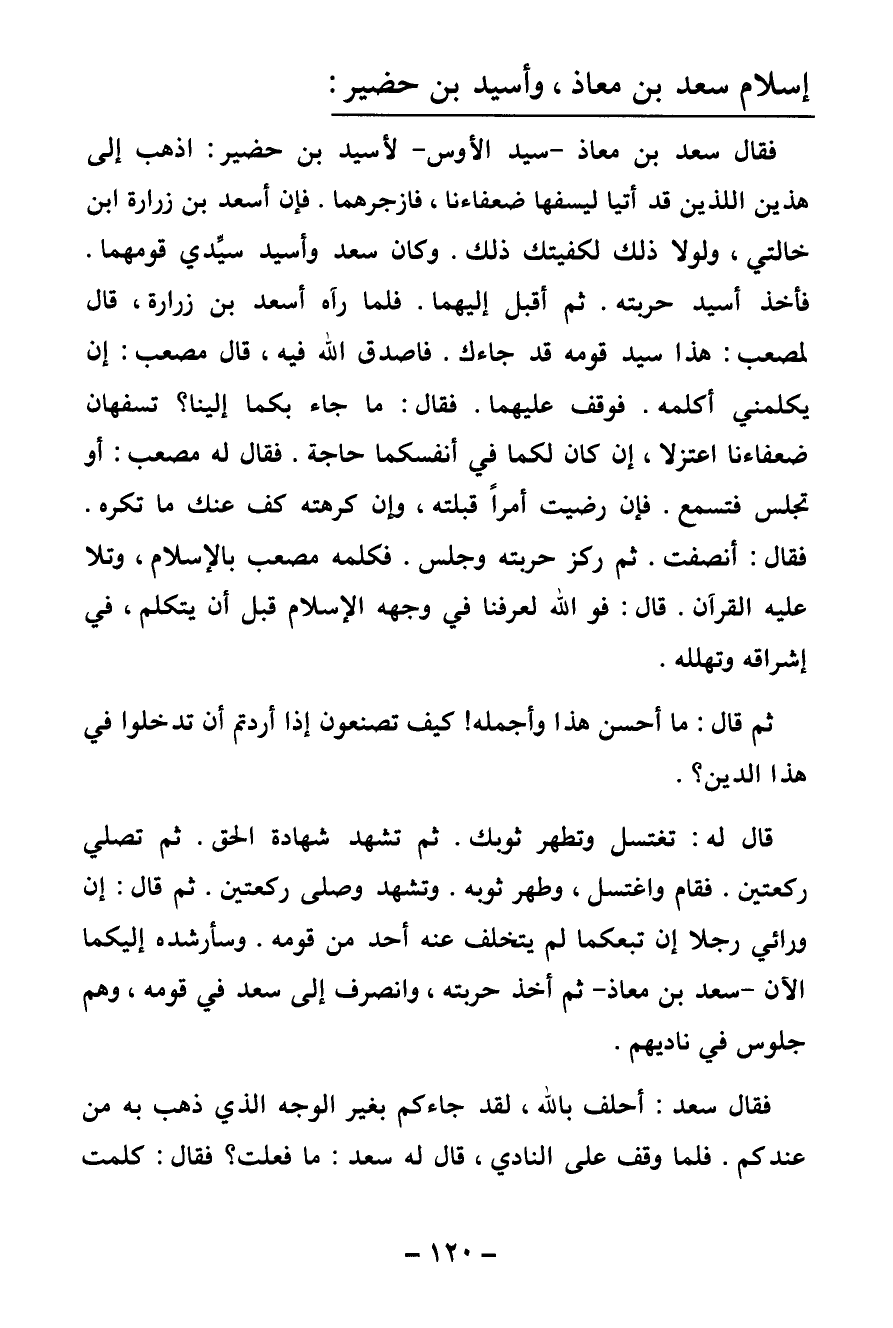 إسلام سعد بن معاذ وأسيد بن حضير فقال سعد بن معاذ - سيد الأوس - لأسيد بن حضير اذهب إلى هذين اللذين قد أتيا ليسفها ضعفاءنا، فازجرهما. فإن أسعد بن زرارة ابن خالتي، ولولا ذلك لكفيتك ذلك. وكان سعد وأسيد سيدي قومهما. فأخذ أسيد حربته. ثم أقبل إليهما. فلما رآه أسعد بن زرارة قال لمصعب هذا سيد قومه قد جاءك. فاصدق اللَّه فيه. قال مصعب إن يكلمني أكلمه. فوقف عليهما. فقال ما جاء بكما إلينا؟ تسفهان ضعفاءنا؟ اعتزلا، إن كان لكما في أنفسكما حاجة. فقال له مصعب أو تجلس فتسمع. فإن رضيت أمرا قبلته، وإن كرهته كف عنك ما تكره. فقال أنصفت. ثم ركز حربته وجلس فكلمه مصعب بالإسلام وتلا عليه القرآن. قال فواللَّه لعرفنا في وجهه الإسلام قبل أن يتكلم في إشراقه وتهلله.
