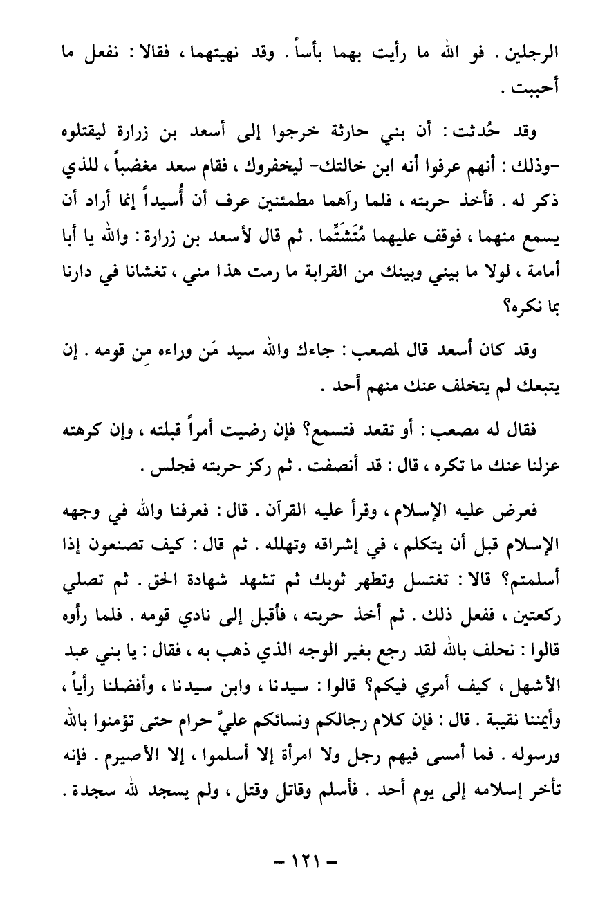 وقد كان أسعد قال لمصعب جاءك واللَّه سيد من ورائه قومه. إن يتبعك لم يتخلف عنك منهم أحد.
