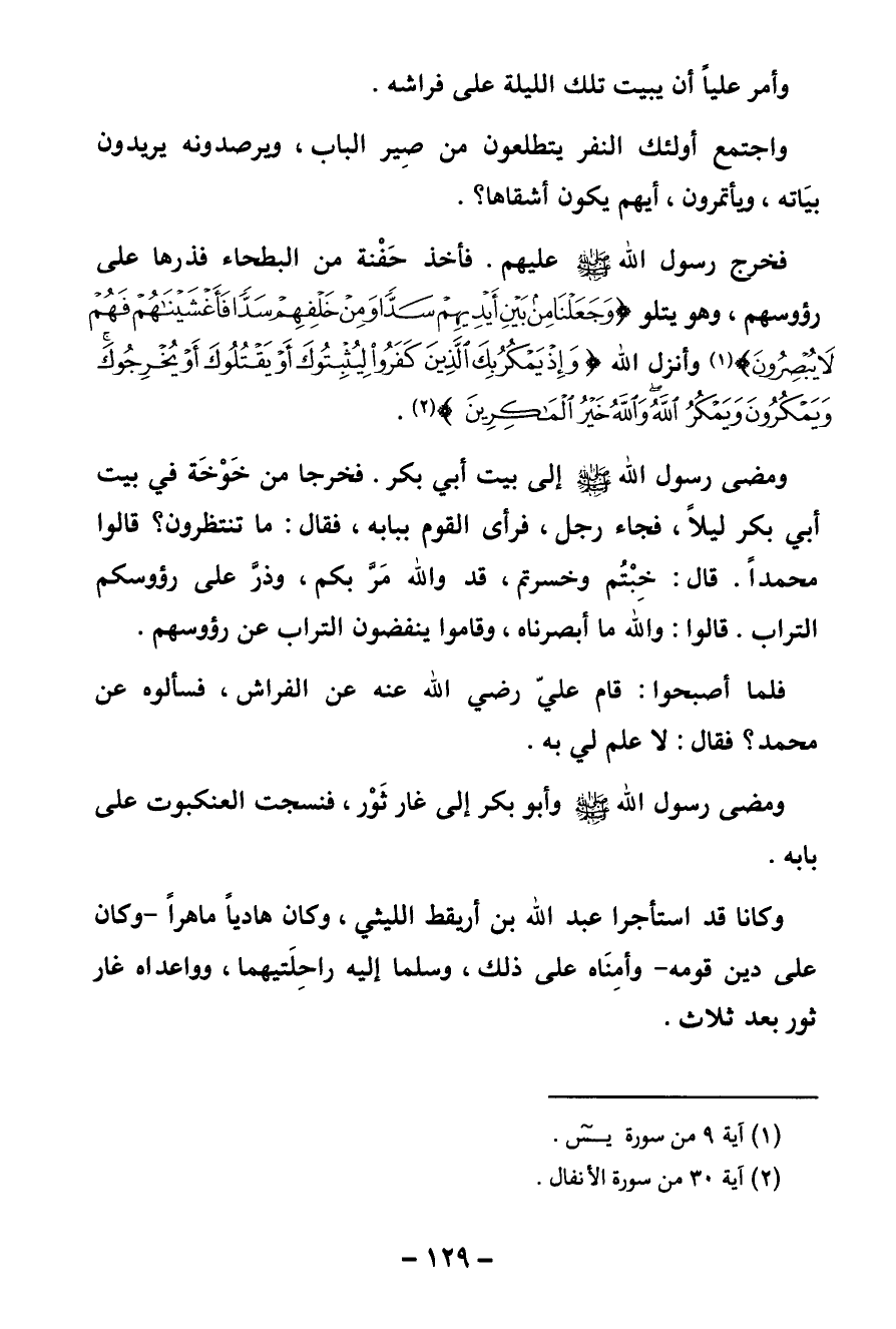 واجتمع أولئك النفر يتطلعون من صير الباب ويرصدونه يريدون بياته ويأتمرون أيهم يكون أشقاها؟ فخرج رسول اللَّه -صلى اللَّه عليه وسلم - عليهم. فأخذ حفنة من البطحاء فذرها على رءوسهم وهو يتلو {وَجَعَلْنَا مِنْ بَيْنِ أَيْدِيهِمْ سَدًّا وَمِنْ خَلْفِهِمْ سَدًّا فَأَغْشَيْنَاهُمْ فَهُمْ لَا يُبْصِرُونَ} [يس: 9] (¬1) وأنزل اللَّه {وَإِذْ يَمْكُرُ بِكَ الَّذِينَ كَفَرُوا لِيُثْبِتُوكَ أَوْ يَقْتُلُوكَ أَوْ يُخْرِجُوكَ وَيَمْكُرُونَ وَيَمْكُرُ اللَّهُ وَاللَّهُ خَيْرُ الْمَاكِرِينَ} [الأنفال: 30] (¬2) .