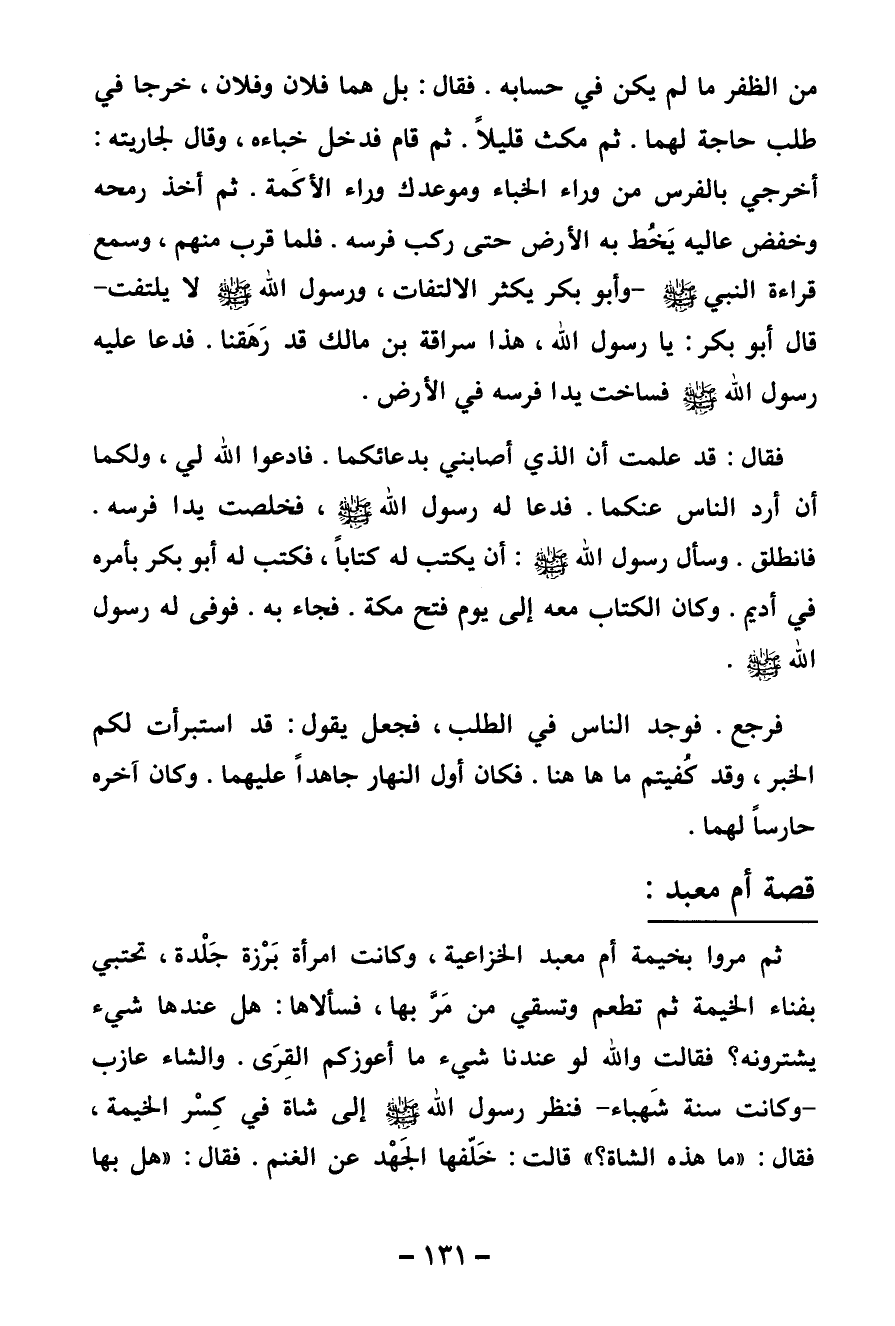 قصة أم معبد ثم مروا بخيمة أم معبد الخزاعية، وكانت امرأة برزة جلدة تحتبي بفناء الخيمة ثم تطعم وتسقي من مر بها، فسألاها: هل عندها شيء يشترونه؟ فقالت واللَّه لو عندنا شيء ما أعوزكم القرى. والشاء عازب - وكانت سنة شهباء - فنظر رسول اللَّه -صلى اللَّه عليه وسلم - إلى شاة في كسر الخيمة فقال «ما هذه الشاة؟» قالت خلفها الجهد عن الغنم. فقال «هل بها