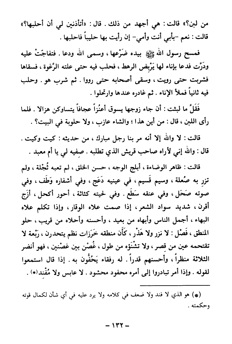 من لبن؟» قالت: هي أجهد من ذلك. قال «أتأذنين لي أن أحلبها؟» قالت: نعم - بأبي أنت وأمي - إن رأيت بها حليبا فاحلبها.