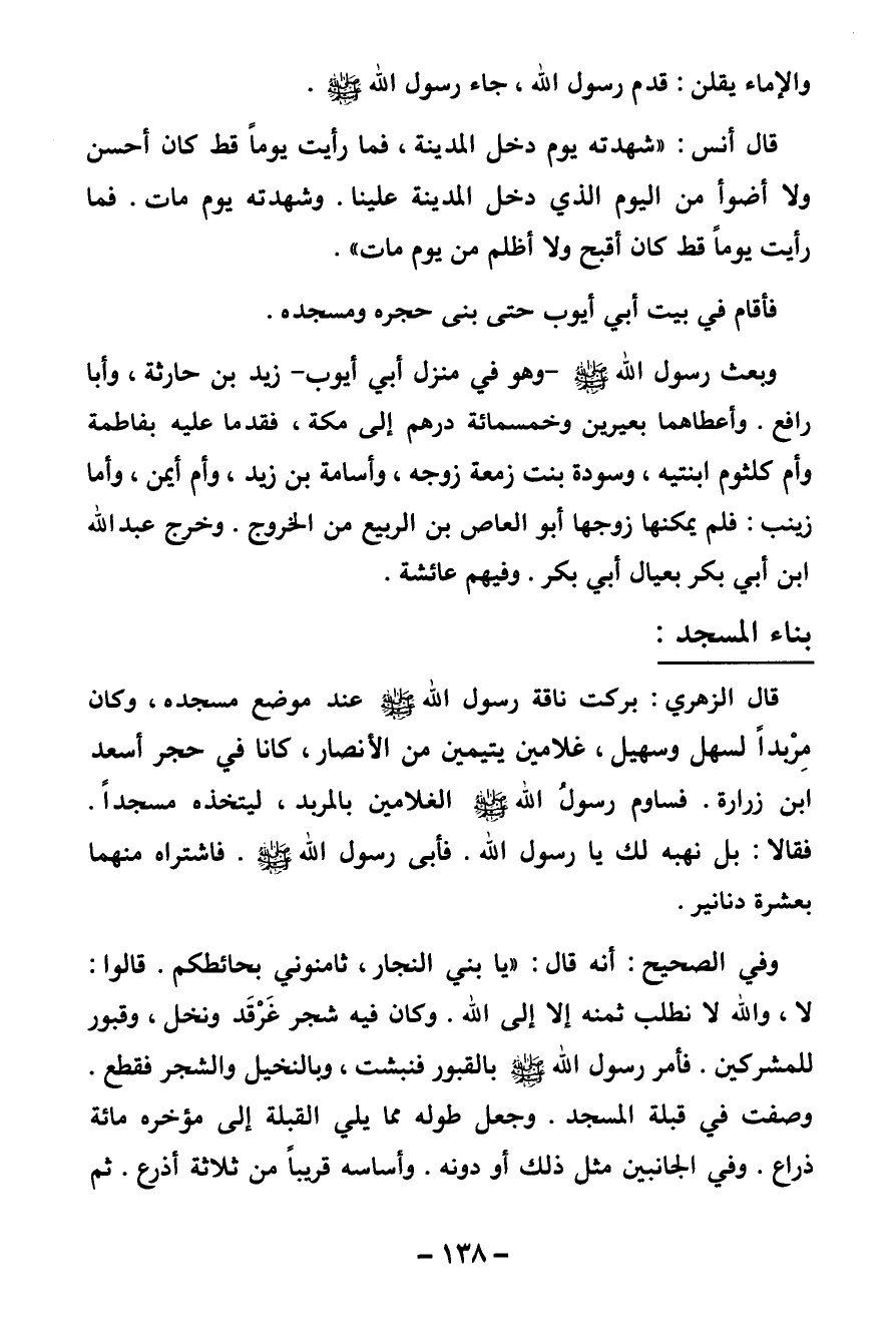 بناء المسجد قال الزهري: بركت ناقة رسول اللَّه -صلى اللَّه عليه وسلم - عند موضع مسجده وكان مربدا لسهل وسهيل غلامين يتيمين من الأنصار، كانا في حجر أسعد بن زرارة. فساوم رسول اللَّه -صلى اللَّه عليه وسلم - الغلامين بالمربد ليتخذه مسجدا فقالا: بل نهبه لك يا رسول اللَّه. فأبى رسول اللَّه صلى الله عليه وسلم فاشتراه منهما بعشرة دنانير.