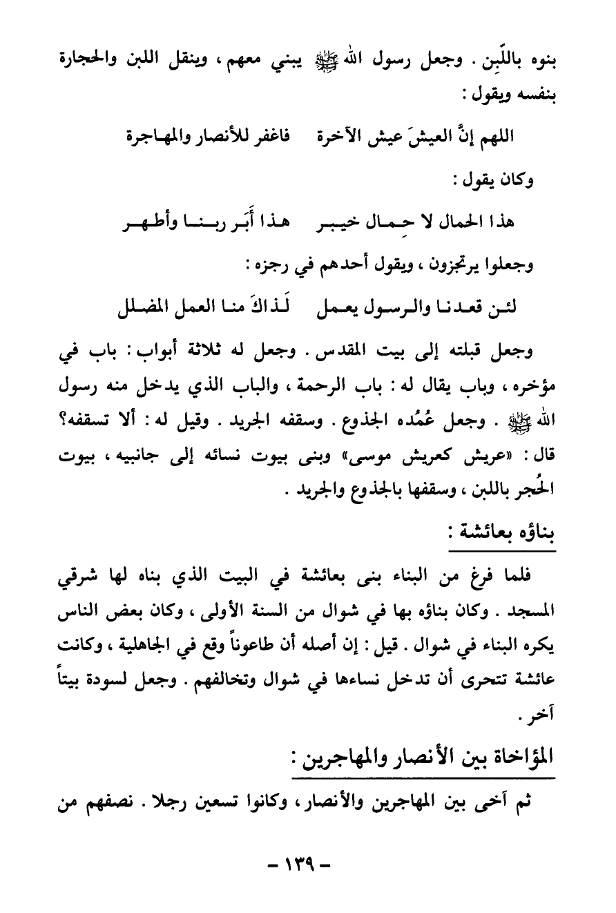بنوه باللبن. وجعل رسول اللَّه -صلى اللَّه عليه وسلم - يبني معهم وينقل اللبن والحجارة بنفسه ويقول: