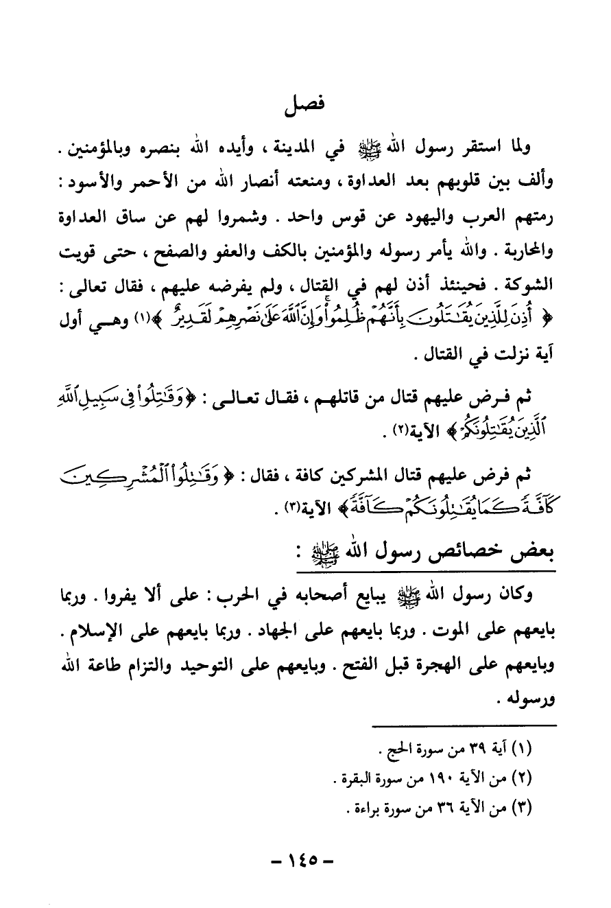 فصل ولما استقر رسول اللَّه -صلى اللَّه عليه وسلم - في المدينة، وأيده اللَّه بنصره وبالمؤمنين. وألف بين قلوبهم بعد العداوة، ومنعته أنصار اللَّه من الأحمر والأسود رمتهم العرب واليهود عن قوس واحد، وشمروا لهم عن ساق العداوة والمحاربة.