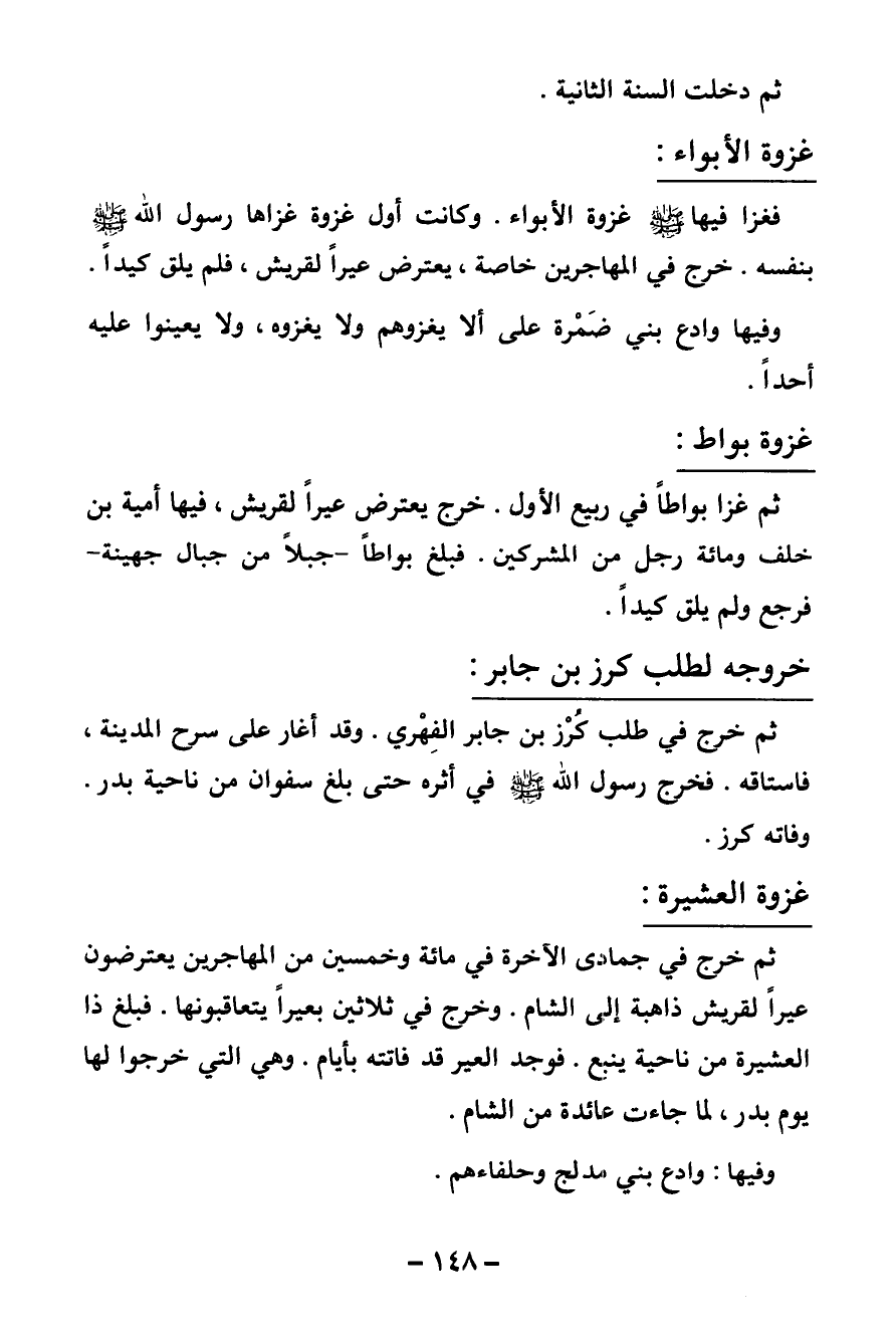 غزوة العشيرة ثم خرج في جمادى الآخرة في مائة وخمسين من المهاجرين يعترضون عيرا لقريش ذاهبة إلى الشام. وخرج في ثلاثين بعيرا يتعاقبونها. فبلغ ذا العشيرة من ناحية ينبع. فوجد العير فاتته بأيام. وهي التي خرجوا لها يوم بدر لما جاءت عائدة من الشام.