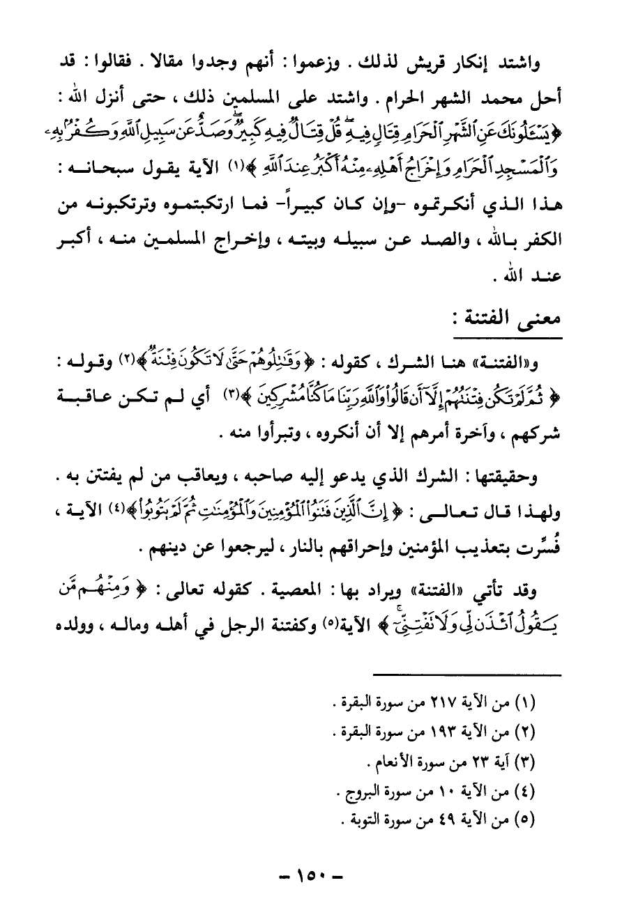 معنى الفتنة و " الفتنة " هنا الشرك كقوله {وَقَاتِلُوهُمْ حَتَّى لَا تَكُونَ فِتْنَةٌ} [البقرة: 193] (¬2) وقوله {ثُمَّ لَمْ تَكُنْ فِتْنَتُهُمْ إِلَّا أَنْ قَالُوا وَاللَّهِ رَبِّنَا مَا كُنَّا مُشْرِكِينَ} [الأنعام: 23] (¬3) أي لم تكن عاقبة شركهم وآخرة أمرهم إلا أن أنكروه وتبرءوا منه.