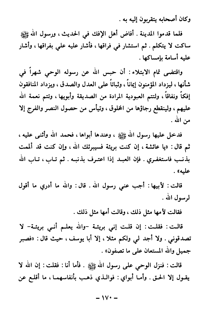 قالت فقلت: إن قلت إني بريئة - واللَّه يعلم أني بريئة - لا تصدقوني. ولا أجد لي ولكم مثلا. إلا أبا يوسف حيث قال {فَصَبْرٌ جَمِيلٌ وَاللَّهُ الْمُسْتَعَانُ عَلَى مَا تَصِفُونَ} [يوسف: 18]