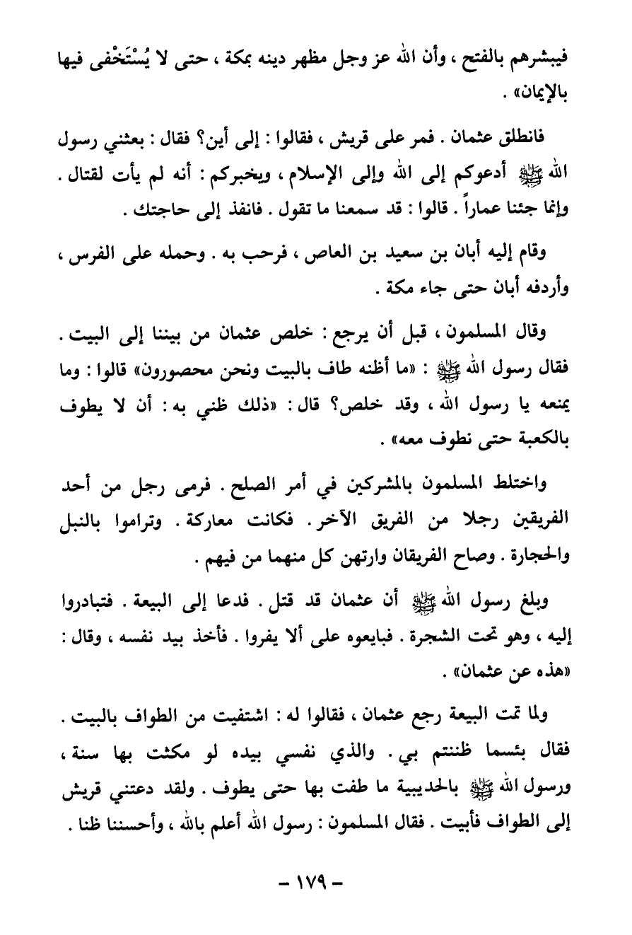 فانطلق عثمان. فمر على قريش. فقالوا: إلى أين؟ فقال بعثني رسول اللَّه -صلى اللَّه عليه وسلم - أدعوكم إلى اللَّه وإلى الإسلام ويخبركم أنه لم يأت لقتال. وإنما جئنا عمارا. قالوا: قد سمعنا ما تقول. فانفذ إلى حاجتك.