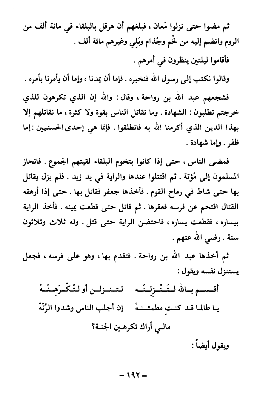وقالوا: نكتب إلى رسول اللَّه فنخبره. فإما أن يمدنا، وإما أن يأمرنا بأمره فشجعهم عبد اللَّه بن رواحة، وقال واللَّه إن الذي تكرهون للذي خرجتم تطلبون الشهادة. وما نقاتل الناس بقوة ولا كثرة وما نقاتلهم إلا بهذا الدين الذي أكرمنا اللَّه به فانطلقوا فإنما هي إحدى الحسنيين إما ظفر. وإما شهادة.