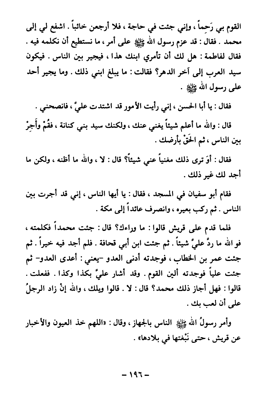 القوم بي رحما، وإني جئت في حاجة، فلا أرجعن خائبا. اشفع لي إلى محمد. فقال: قد عزم رسول الله صلى الله عليه وسلم على أمر، ما نستطيع أن نكلمه فيه. فقال لفاطمة: هل لك أن تأمري ابنك هذا، فيجير بين الناس. فيكون سيد العرب إلى آخر الدهر؟ فقالت: ما يبلغ ابني ذلك. وما يجير أحد على رسول الله صلى الله عليه وسلم.