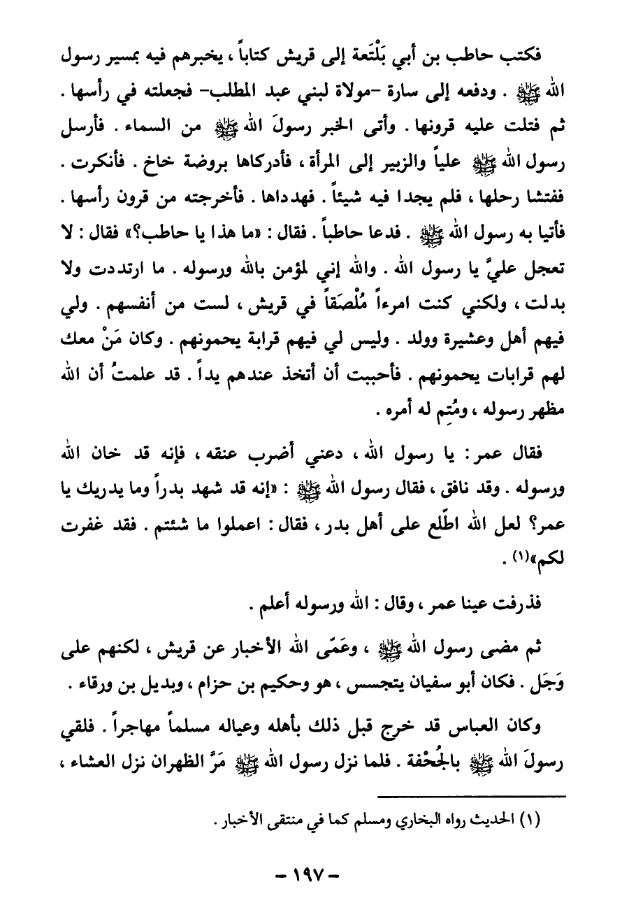 فكتب حاطب بن أبي بلتعة إلى قريش كتابا، يخبرهم فيه بمسير رسول الله صلى الله عليه وسلم. ودفعه إلى سارة - مولاة لبني عبد المطلب - فجعلته في رأسها. ثم فتلت عليه قرونها. وأتى الخبر رسول الله صلى الله عليه وسلم من السماء. فأرسل رسول الله صلى الله عليه وسلم عليا والزبير إلى المرأة، فأدركاها بروضة خاخ. فأنكرت. ففتشا رحلها، فلم يجدا فيه شيئا. فهدداها. فأخرجته من قرون رأسها. فأتيا به رسول الله صلى الله عليه وسلم. فدعا حاطبا. فقال: «ما هذا يا حاطب» ؟ " فقال: لا تعجل علي يا رسول الله. والله إني لمؤمن بالله ورسوله. وما ارتددت ولا بدلت، ولكني كنت امرءا ملصقا في قريش، لست من أنفسهم. ولي فيهم أهل وعشيرة وولد. وليس لي فيهم قرابة يحمونهم. وكان من معك لهم قرابات يحمونهم. فأحببت أن أتخذ عندهم يدا. قد علمت أن الله مظهر رسوله، ومتم له أمره.
