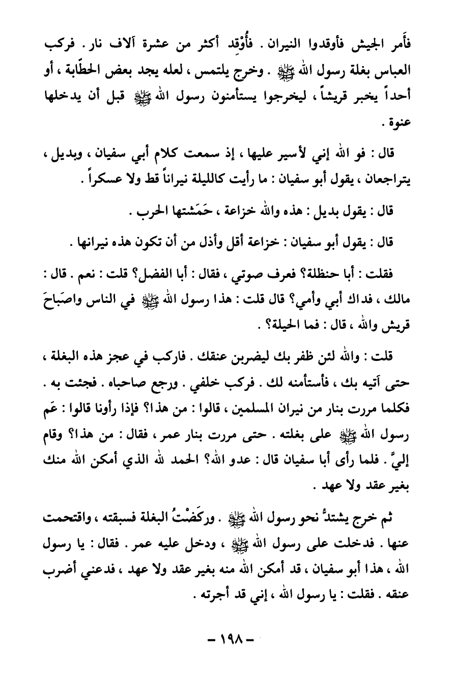 قلت: والله لئن ظفر بك ليضربن عنقك. فاركب في عجز هذه البغلة، حتى آتيه بك، فأستأمنه لك. فركب خلفي. ورجع صاحباه. فجئت به. فكلما مررت بنار من نيران المسلمين، قالوا: من هذا؟ فإذا رأونا قالوا: عم رسول الله صلى الله عليه وسلم على بغلته. حتى مررت بنار عمر، فقال: من هذا؟ وقام إلي. فلما رأى أبا سفيان قال: عدو الله؟ الحمد لله الذي أمكن الله منك بغير عقد ولا عهد.