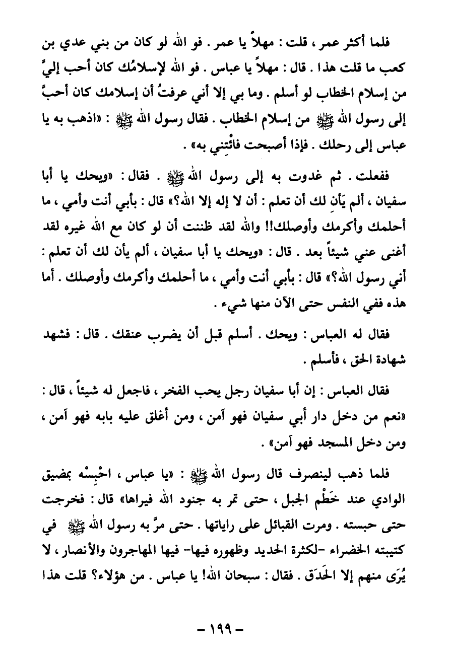 فلما ذهب لينصرف قال رسول الله صلى الله عليه وسلم: «يا عباس، احبسه بمضيق الوادي عند خطم الجبل، حتى تمر به جنود الله فيراها» قال: فخرجت حتى حبسته. ومرت القبائل على راياتها. حتى مر به رسول الله صلى الله عليه وسلم في كتيبته الخضراء - لكثرة الحديد وظهوره فيها - فيها المهاجرون والأنصار، لا يرى منهم إلا الحدق. فقال: سبحان الله! يا عباس. من هؤلاء؟ قلت: هذا