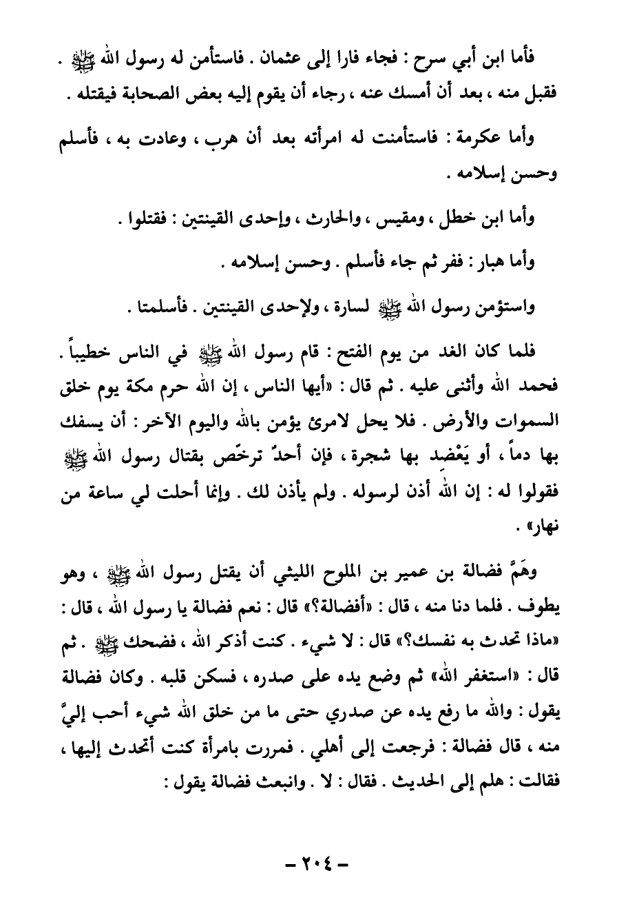 فلما كان الغد من يوم الفتح: قام رسول الله صلى الله عليه وسلم في الناس خطيبا. فحمد الله وأثنى عليه. ثم قال: «أيها الناس، إن الله حرم مكة يوم خلق السماوات والأرض. فلا يحل لامرئ يؤمن بالله واليوم الآخر: أن يسفك بها دما، أو يعضد بها شجرة، فإن أحد ترخص بقتال رسول الله صلى الله عليه وسلم فقولوا له: إن الله أذن لرسوله. ولم يأذن لك. وإنما أحلت لي ساعة من نهار» .