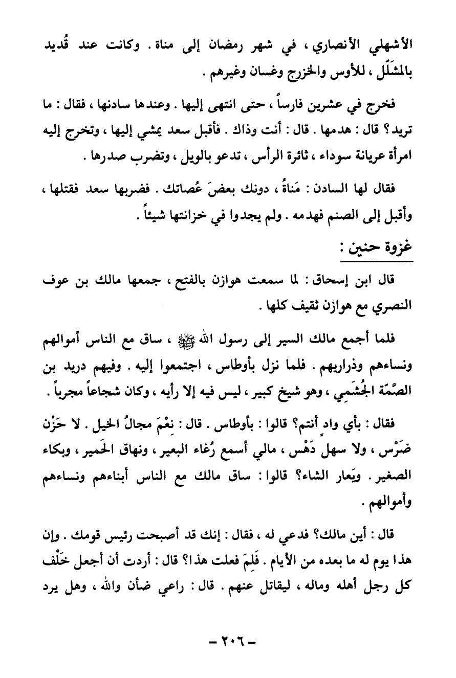 غزوة حنين قال ابن إسحاق: لما سمعت هوازن بالفتح، جمعها مالك بن عوف النصري مع هوازن ثقيف كلها.