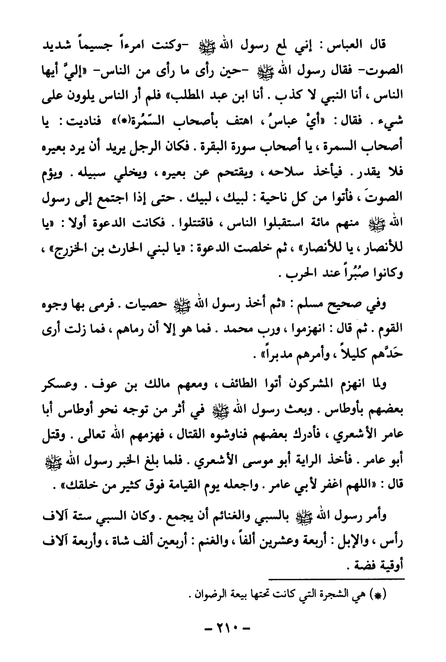 قال العباس: إني لمع رسول الله صلى الله عليه وسلم - وكنت امرءا جسيما شديد الصوت - فقال رسول الله صلى الله عليه وسلم - حين رأى ما رأى من الناس - «إلي أيها الناس، أنا النبي لا كذب. أنا ابن عبد المطلب» فلم أر الناس يلوون على شيء. فقال: «أي عباس، اهتف بأصحاب السمرة» (¬1) " فناديت: يا أصحاب السمرة، يا أصحاب سورة البقرة. فكان الرجل يريد أن يرد بعيره فلا يقدر. فيأخذ سلاحه، ويقتحم عن بعيره، ويخلي سبيله. ويؤم الصوت، فأتوا من كل ناحية: لبيك، لبيك. حتى إذا اجتمع إلى رسول الله صلى الله عليه وسلم منهم مائة استقبلوا الناس، فاقتتلوا. فكانت الدعوة أولا: " يا للأنصار، يا للأنصار "، ثم خلصت الدعوة: " يا لبني الحارث بن الخزرج "، وكانوا صبرا عند الحرب.