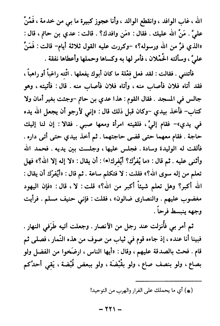 فأتتني. فقالت: لقد فعل فعلة ما كان أبوك يفعلها. ائته راغبا أو راهبا، فقد أتاه فلان فأصاب منه، وأتاه فلان فأصاب منه. قال: فأتيته، وهو جالس في المسجد. فقال القوم: هذا عدي بن حاتم - وجئت بغير أمان ولا كتاب - فأخذ بيدي - وكان قبل ذلك قال: " إني لأرجو أن يجعل الله يده في يدي " - فقام إلي، فلقيت امرأة ومعها صبي. فقالا: إن لنا إليك حاجة. فقام معهما حتى قضى حاجتهما. ثم أخذ بيدي حتى أتى داره. فألقت له الوليدة وسادة. فجلس عليها، وجلست بين يديه. فحمد الله وأثنى عليه. ثم قال: «ما يفرك؟ أيفرك (¬1) أن يقال: " لا إله إلا الله؟ " فهل تعلم من إله سوى الله؟ " فقلت: لا. فتكلم ساعة. ثم قال: " أيفرك أن يقال: الله أكبر؟ وهل تعلم شيئا أكبر من الله؟ " قلت: لا، قال: " فإن اليهود مغضوب عليهم. والنصارى ضالون "، فقلت: فإني حنيف مسلم. فرأيت وجهه ينبسط فرحا» .