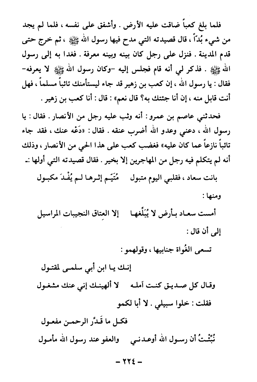 فلما بلغ كعبا ضاقت عليه الأرض. وأشفق على نفسه، فلما لم يجد من شيء بدا، قال قصيدته التي مدح فيها رسول الله صلى الله عليه وسلم، ثم خرج حتى قدم المدينة. فنزل على رجل كان بينه وبينه معرفة. فغدا به إلى رسول الله صلى الله عليه وسلم. فذكر لي أنه قام فجلس إليه - وكان رسول الله صلى الله عليه وسلم لا يعرفه - فقال: «يا رسول الله، إن كعب بن زهير قد جاء ليستأمنك تائبا مسلما، فهل أنت قابل منه، إن أنا جئتك به؟ قال: " نعم ": قال: أنا كعب بن زهير.»
