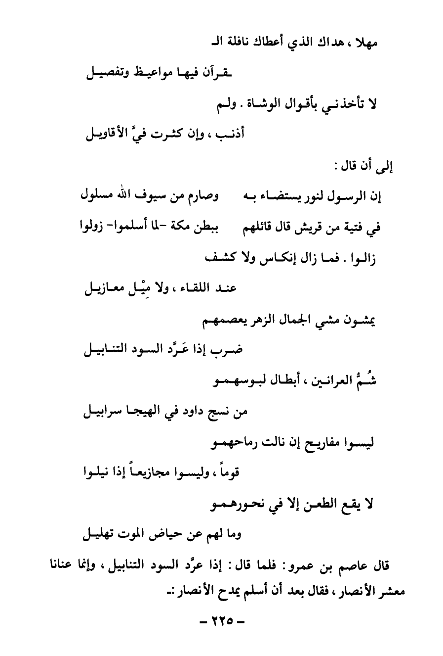 قال عاصم بن عمرو: فلما قال: إذا عرد السود التنابيل، وإنما عنانا معشر الأنصار، فقال بعد أن أسلم يمدح الأنصار: -