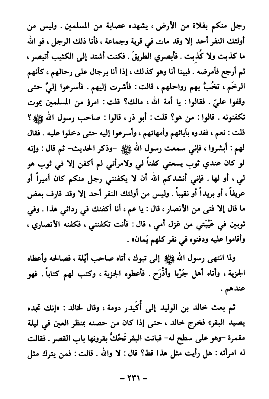 ثم بعث خالد بن الوليد إلى أكيدر دومة، وقال لخالد: «إنك تجده يصيد البقر» فخرج خالد، حتى إذا كان من حصنه بمنظر العين في ليلة مقمرة - وهو على سطح له - فبانت البقر تحك بقرونها باب القصر. فقالت له امرأته: هل رأيت مثل هذا قط؟ قال: لا والله. قالت: فمن يترك مثل