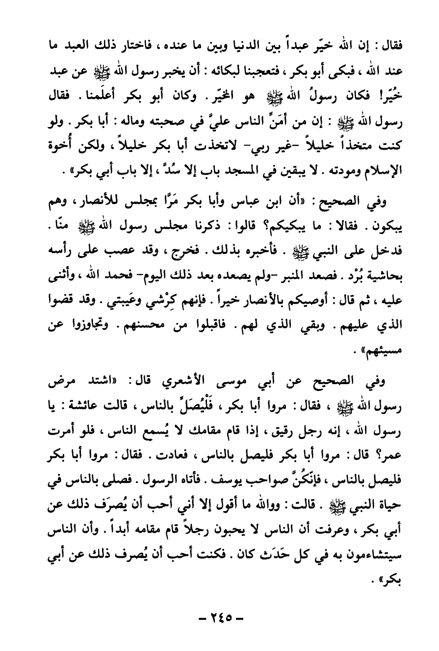 فقال: إن الله خير عبدا بين الدنيا وبين ما عنده، فاختار ذلك العبد ما عند الله. فبكى أبو بكر، فتعجبنا لبكائه: أن يخبر رسول الله صلى الله عليه وسلم عن عبد خير! فكان رسول الله صلى الله عليه وسلم هو المخير. وكان أبو بكر أعلمنا. فقال رسول الله صلى الله عليه وسلم: إن من أمن الناس علي في صحبته وماله: أبو بكر. ولو كنت متخذا خليلا - غير ربي - لاتخذت أبا بكر خليلا، ولكن أخوة الإسلام ومودته. لا يبقين في المسجد باب إلا سد، إلا باب أبي بكر» .