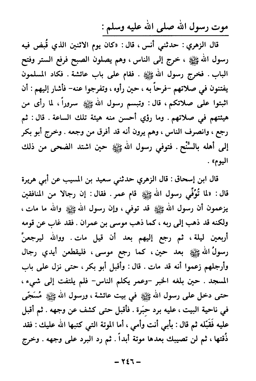 قال ابن إسحاق: قال الزهري حدثني سعيد بن المسيب عن أبي هريرة قال: «لما توفي رسول الله صلى الله عليه وسلم قام عمر. فقال: إن رجالا من المنافقين يزعمون أن رسول الله صلى الله عليه وسلم قد توفي، وإن رسول الله صلى الله عليه وسلم والله ما مات، ولكنه قد ذهب إلى ربه، كما ذهب موسى بن عمران. فقد غاب عن قومه أربعين ليلة، ثم رجع إليهم بعد أن قيل مات. ووالله ليرجعن رسول الله صلى الله عليه وسلم بعد حين، كما رجع موسى، فليقطعن أيدي رجال وأرجلهم زعموا أنه قد مات. قال: وأقبل أبو بكر، حتى نزل على باب المسجد. حين بلغه الخبر - وعمر يكلم الناس - فلم يلتفت إلى شيء، حتى دخل على رسول الله صلى الله عليه وسلم في بيت عائشة، ورسول الله صلى الله عليه وسلم مسجى في ناحية البيت، عليه برد حبرة. فأقبل حتى كشف عن وجهه. ثم أقبل عليه فقبله ثم قال: بأبي أنت وأمي، أما الموتة التي كتبها الله عليك: فقد ذقتها، ثم لن تصيبك بعدها موتة أبدا. ثم رد البرد على وجهه. وخرج