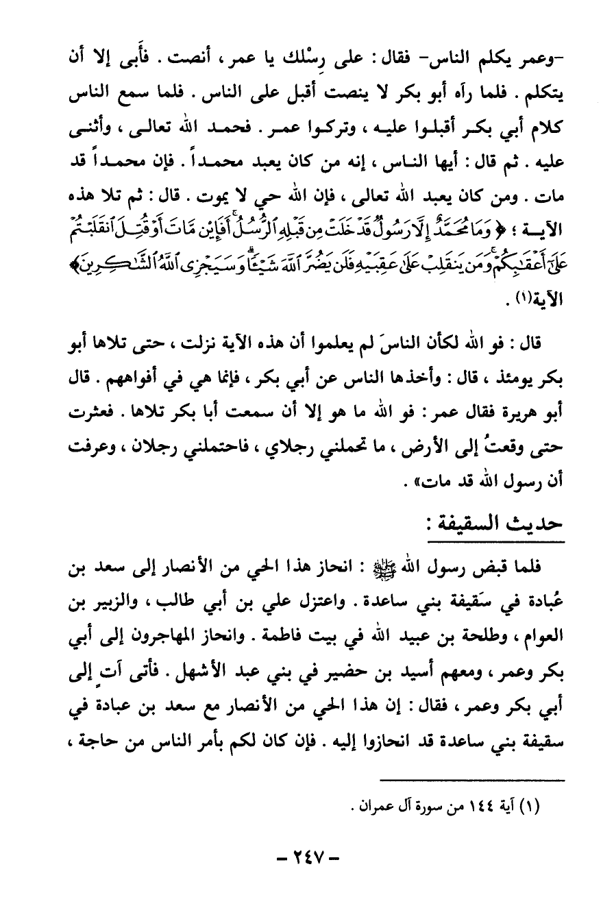 - وعمر يكلم الناس - فقال: على رسلك يا عمر، أنصت. فأبى إلا أن يتكلم. فلما رآه أبو بكر لا ينصت أقبل على الناس. فلما سمع الناس كلام أبي بكر أقبلوا عليه، وتركوا عمر. فحمد الله تعالى، وأثنى عليه. ثم قال: أيها الناس، أنه من كان يعبد محمدا. فإن محمدا قد مات. ومن كان يعبد الله تعالى، فإن الله حي لا يموت. قال: ثم تلا هذه الآية؛ {وَمَا مُحَمَّدٌ إِلَّا رَسُولٌ قَدْ خَلَتْ مِنْ قَبْلِهِ الرُّسُلُ أَفَإِنْ مَاتَ أَوْ قُتِلَ انْقَلَبْتُمْ عَلَى أَعْقَابِكُمْ وَمَنْ يَنْقَلِبْ عَلَى عَقِبَيْهِ فَلَنْ يَضُرَّ اللَّهَ شَيْئًا وَسَيَجْزِي اللَّهُ الشَّاكِرِينَ} [آل عمران: 144] » الآية (¬1) .