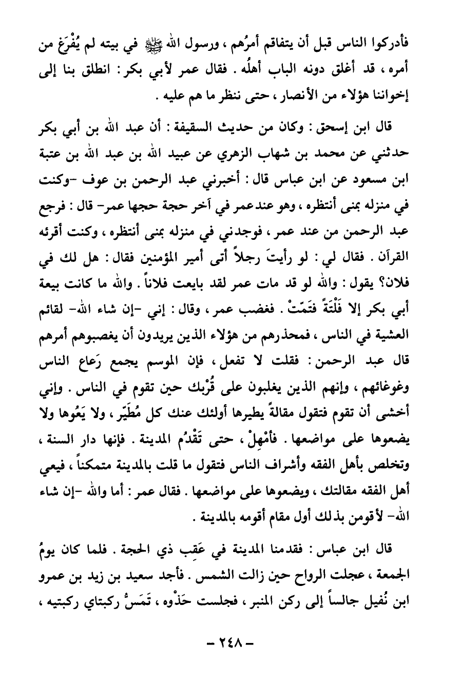 قال ابن إسحاق: وكان من حديث السقيفة: أن عبد الله بن أبي بكر حدثني عن محمد بن شهاب الزهري عن عبيد الله بن عبد الله بن عتبة بن مسعود عن ابن عباس قال: أخبرني عبد الرحمن بن عوف - وكنت في منزله بمنى أنتظره، وهو عند عمر في آخر حجة حجها عمر - قال: فرجع عبد الرحمن من عند عمر، فوجدني في منزله بمنى أنتظره، وكنت أقرئه القرآن. فقال لي: لو رأيت رجلا أتى أمير المؤمنين فقال: هل لك في فلان؟ يقول: والله لو قد مات عمر لقد بايعت فلانا. والله ما كانت بيعة أبي بكر إلا فلتة فتمت. فغضب عمر، وقال: إني - إن شاء الله - لقائم العشية في الناس، فمحذرهم من هؤلاء الذين يريدون أن يغصبوهم أمرهم، قال عبد الرحمن: فقلت لا تفعل، فإن الموسم يجمع رعاع الناس وغوغائهم، وإنهم الذين يغلبون على قربك حين تقوم في الناس. وإني أخشى أن تقوم فتقول مقالة يطيرها أولئك عنك كل مطير، ولا يعوها ولا يضعوها على مواضعها. فأمهل، حتى تقدم المدينة. فإنها دار السنة، وتخلص بأهل الفقه وأشراف الناس فتقول ما قلت بالمدينة متمكنا، فيعي أهل الفقه مقالتك، ويضعوها على مواضعها. فقال عمر: أما والله - إن شاء الله - لأقومن بذلك أول مقام أقومه بالمدينة.