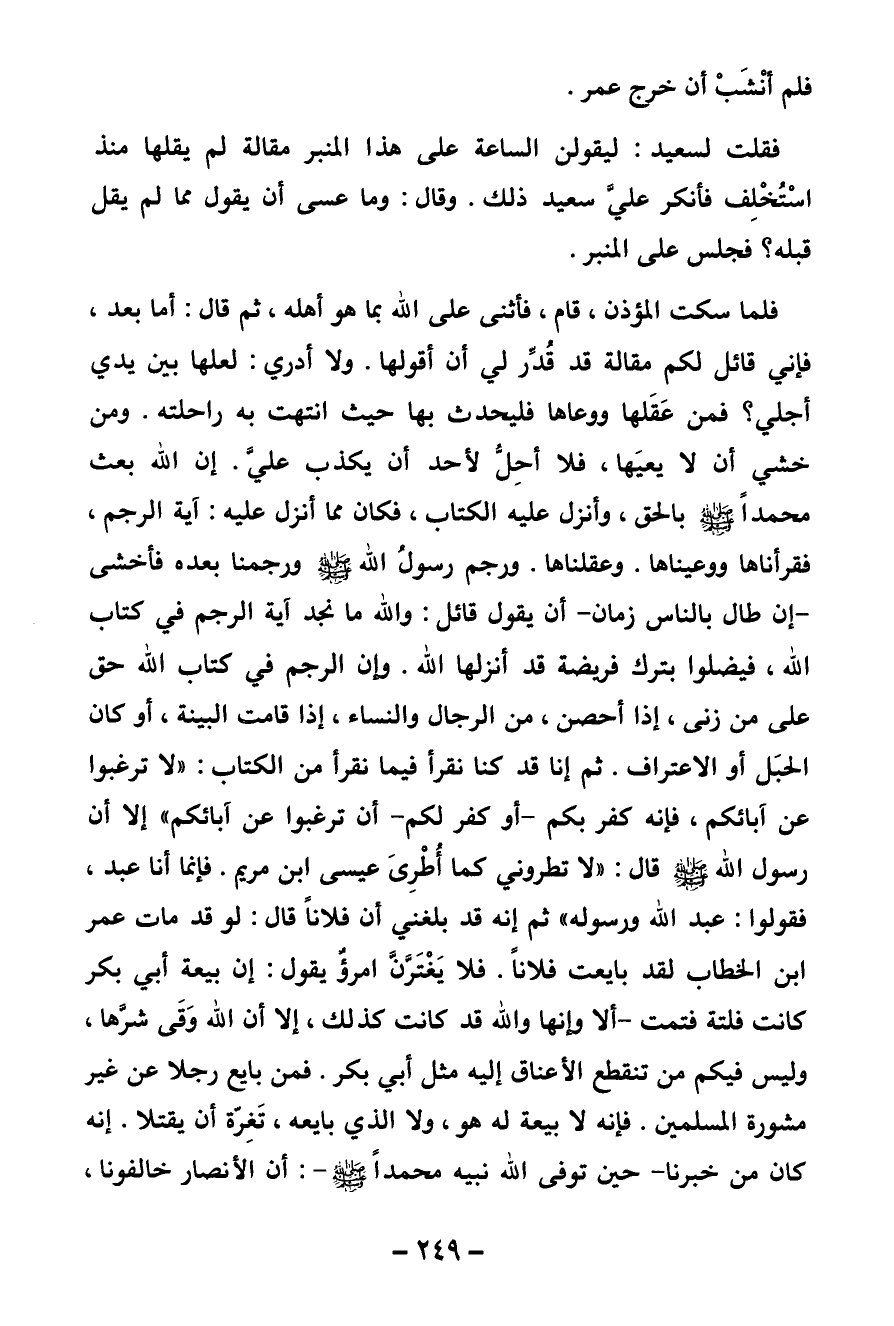 فلما سكت المؤذن، قام، فأثنى على الله بما هو أهله، ثم قال: أما بعد، فإني قائل لكم مقالة قد قدر لي أن أقولها. ولا أدري: لعلها بين يدي أجلي؟ فمن عقلها ووعاها فليحدث بها حيث انتهت به راحلته. ومن خشي ألا يعيها، فلا أحل لأحد أن يكذب علي. إن الله بعث محمدا صلى الله عليه وسلم بالحق، وأنزل عليه الكتاب، فكان مما أنزل عليه: آية الرجم، فقرأناها ووعيناها. وعقلناها. ورجم رسول الله صلى الله عليه وسلم ورجمنا بعده فأخشى - إن طال بالناس زمان - أن يقول قائل: والله ما نجد آية الرجم في كتاب الله، فيضلوا بترك فريضة قد أنزلها الله. وإن الرجم في كتاب الله حق على من زنى، إذا أحصن، من الرجال والنساء، إذا قامت البينة، أو كان الحبل أو الاعتراف. ثم إنا قد كنا نقرأ فيما نقرأ من الكتاب: " لا ترغبوا عن آبائكم، فأنه كفر بكم - أو كفر لكم - أن ترغبوا عن آبائكم " إلا أن رسول الله صلى الله عليه وسلم قال: «لا تطروني كما أطري عيسى ابن مريم. فإنما أنا عبد، فقولوا: عبد الله ورسوله» ثم أنه قد بلغني أن فلانا قال: لو قد مات عمر بن الخطاب لقد بايعت فلانا. فلا يغترن امرؤ يقول: إن بيعة أبي بكر كانت فلتة فتمت - ألا وإنها والله قد كانت كذلك، إلا أن الله وقى شرها، وليس فيكم من تنقطع الأعناق إليه مثل أبي بكر. فمن بايع رجلا عن غير مشورة المسلمين. فأنه لا بيعة له هو، ولا الذي بايعه، تغرة أن يقتلا. أنه كان من خبرنا - حين توفى الله نبيه محمدا صلى الله عليه وسلم -: أن الأنصار خالفونا،