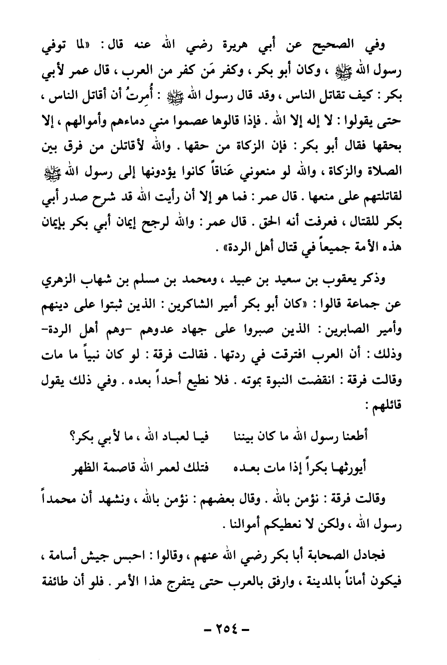 وذكر يعقوب بن سعيد بن عبيد، ومحمد بن مسلم بن شهاب الزهري عن جماعة قالوا: " كان أبو بكر أمير الشاكرين: الذين ثبتوا على دينهم وأمير الصابرين: الذين صبروا على جهاد عدوهم - وهم أهل الردة - وذلك: أن العرب افترقت في ردتها. فقالت فرقة: لو كان نبيا ما مات وقالت فرقة: انقضت النبوة بموته. فلا نطيع أحدا بعده. وفي ذلك يقول قائلهم: