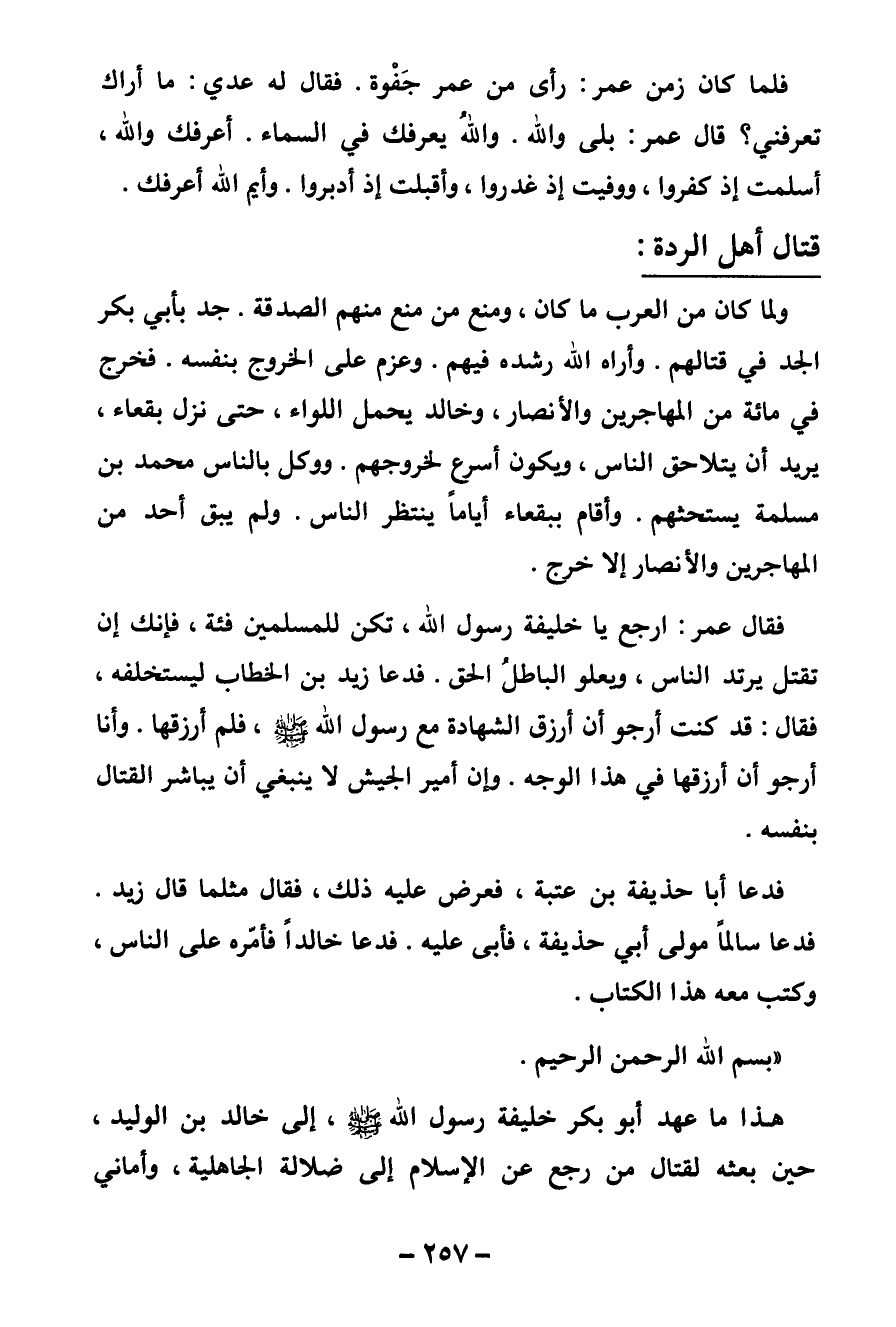 هذا ما عهد أبو بكر خليفة رسول الله صلى الله عليه وسلم إلى خالد بن الوليد حين بعثه لقتال من رجع عن الإسلام إلى ضلالة الجاهلية وأماني
