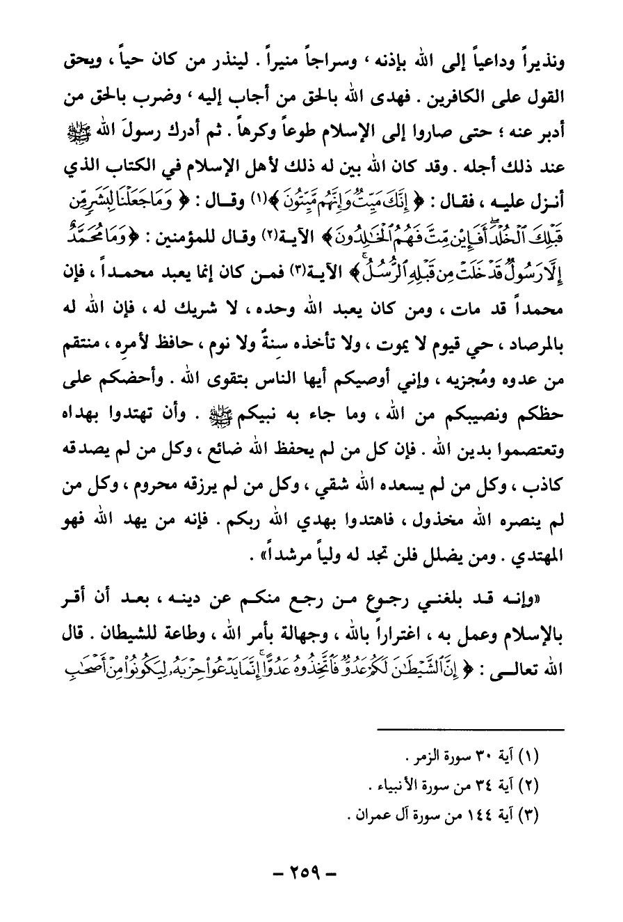 ونذيرا وداعيا إلى الله بإذنه وسراجا منيرا، لينذر من كان حيا، ويحق القول على الكافرين. فهدى الله بالحق من أجاب إليه وضرب بالحق من أدبر عنه حتى صاروا إلى الإسلام طوعا وكرها. ثم أدرك رسول الله صلى الله عليه وسلم عند ذلك أجله. وقد كان الله بين له ذلك لأهل الإسلام في الكتاب الذي أنزل عليه فقال: {إِنَّكَ مَيِّتٌ وَإِنَّهُمْ مَيِّتُونَ} [الزمر: 30] (¬1) وقال: {وَمَا جَعَلْنَا لِبَشَرٍ مِنْ قَبْلِكَ الْخُلْدَ أَفَإِنْ مِتَّ فَهُمُ الْخَالِدُونَ} [الأنبياء: 34] الآية (¬2) وقال للمؤمنين: {وَمَا مُحَمَّدٌ إِلَّا رَسُولٌ قَدْ خَلَتْ مِنْ قَبْلِهِ الرُّسُلُ} [آل عمران: 144] الآية (¬3) فمن كان إنما يعبد محمدا، فإن محمدا قد مات، ومن كان يعبد الله وحده لا شريك له فإن الله له بالمرصاد حي قيوم لا يموت ولا تأخذه سنة ولا نوم حافظ لأمره منتقم من عدوه ومجزيه، وإني أوصيكم أيها الناس بتقوى الله. وأحضكم على حظكم ونصيبكم من الله وما جاء به نبيكم صلى الله عليه وسلم. وأن تهتدوا بهداه. وتعتصموا بدين الله. فإن كل من لم يحفظ الله ضائع وكل من لم يصدقه كاذب وكل من لم يسعده الله شقي وكل من لم يرزقه محروم وكل من لم ينصره الله مخذول. فاهتدوا بهدي الله ربكم. فإنه من يهد الله فهو المهتدي. ومن يضلل فلن تجد له وليا مرشدا.