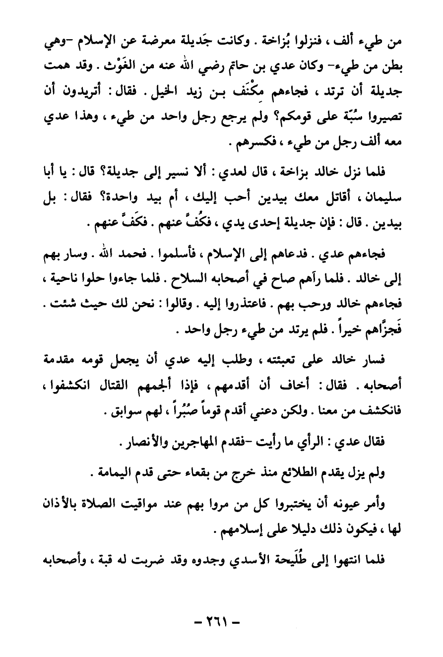 فجاءهم عدي. فدعاهم إلى الإسلام فأسلموا. فحمد الله. وسار بهم إلى خالد. فلما رآهم صاح في أصحابه السلاح. فلما جاءوا حلوا ناحية، فجاءهم خالد ورحب بهم. فاعتذروا إليه. وقالوا: نحن لك حيث شئت. فجزاهم خيرا. فلم يرتد من طيء رجل واحد.